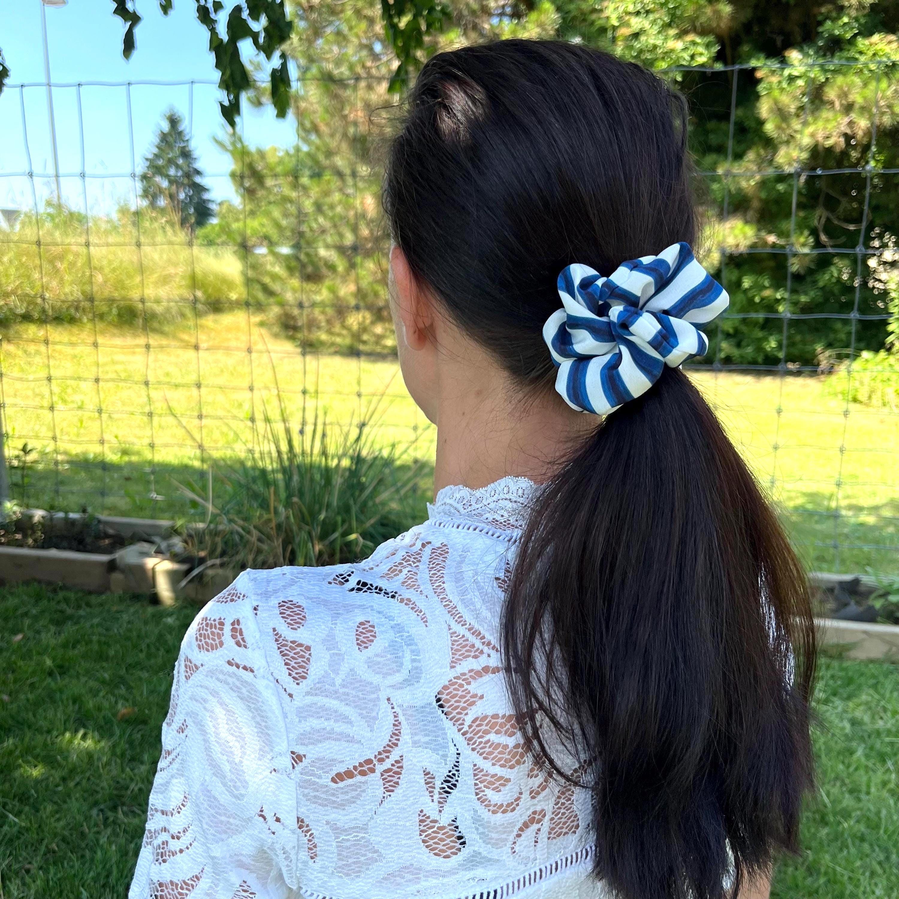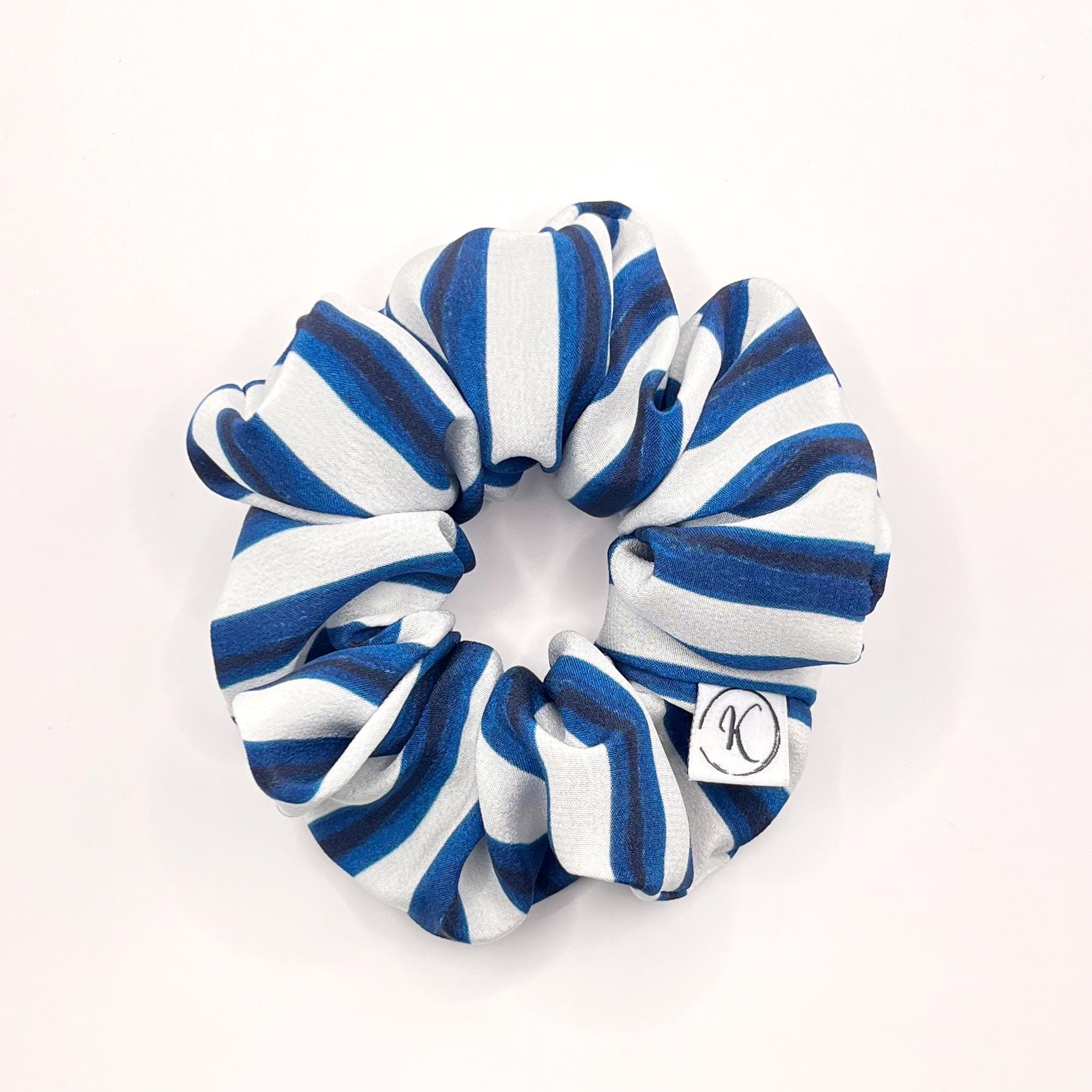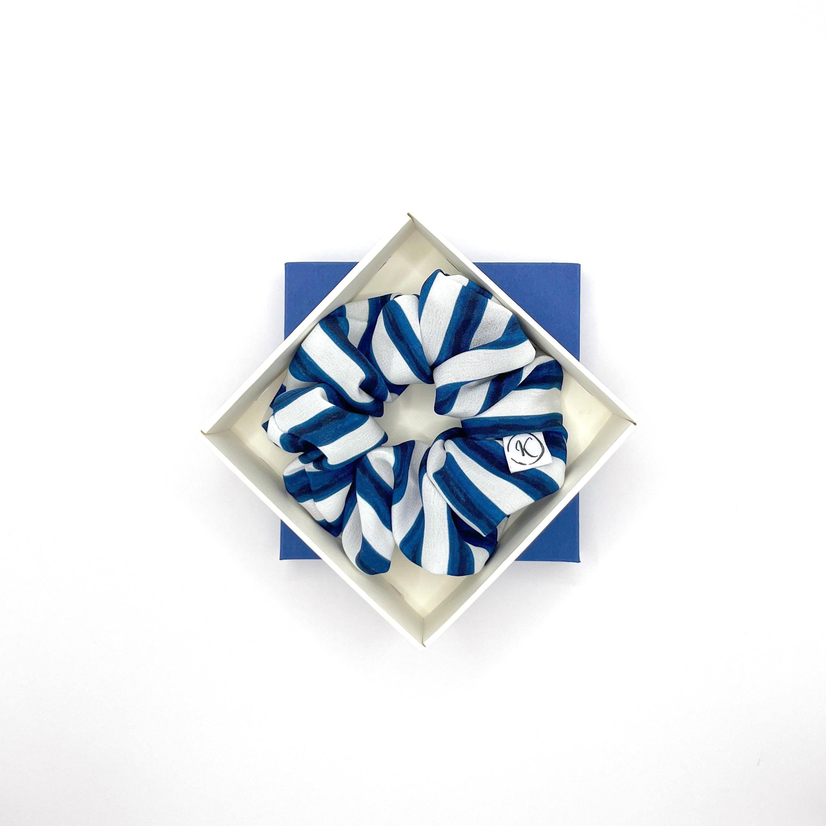 Add a touch of elegance to your hairstyle with this scrunchie, crafted from 100% silk crepe, a discontinued item from an Italian fashion house. Its black, white, and blue striped pattern creates a subtle balance between dynamism and sophistication.