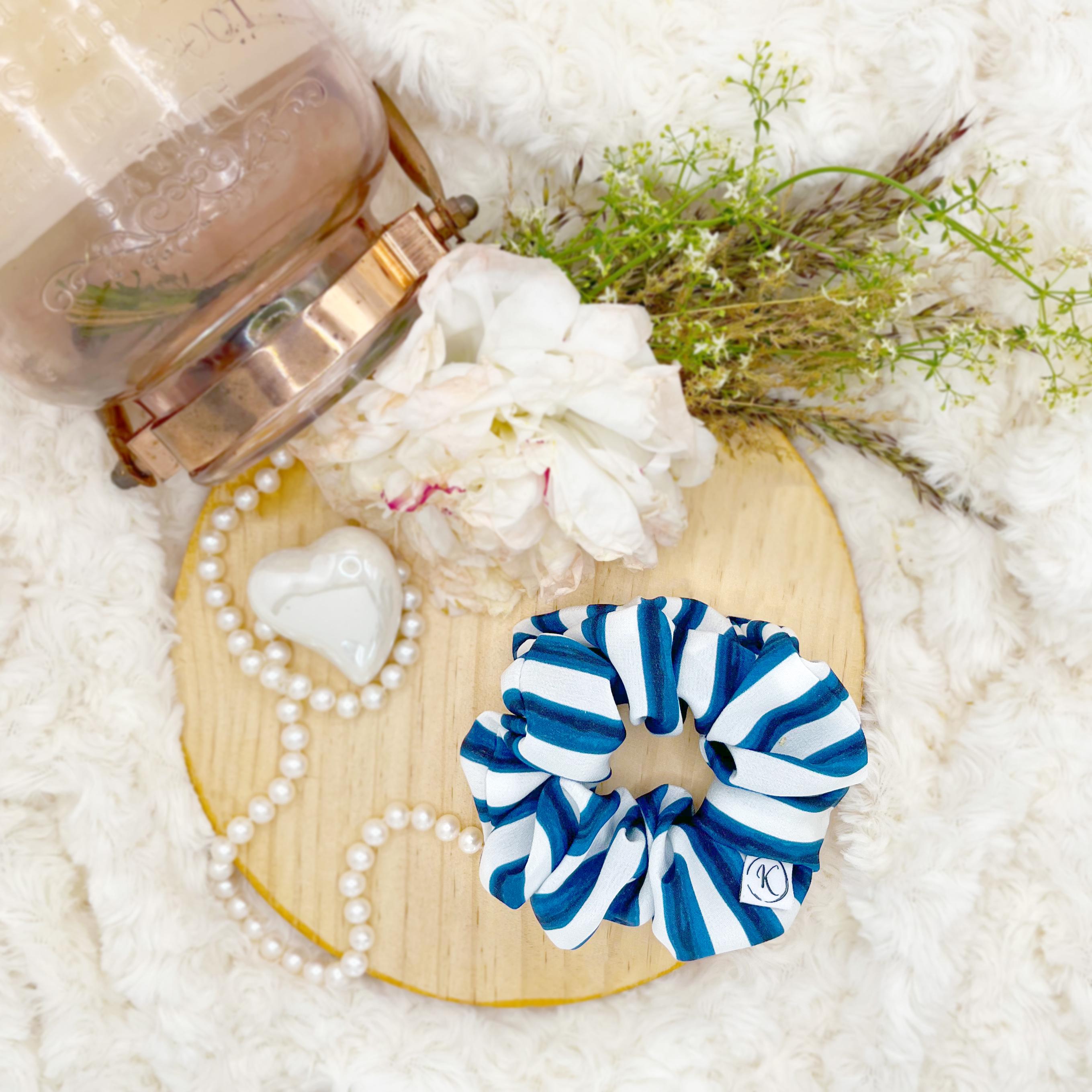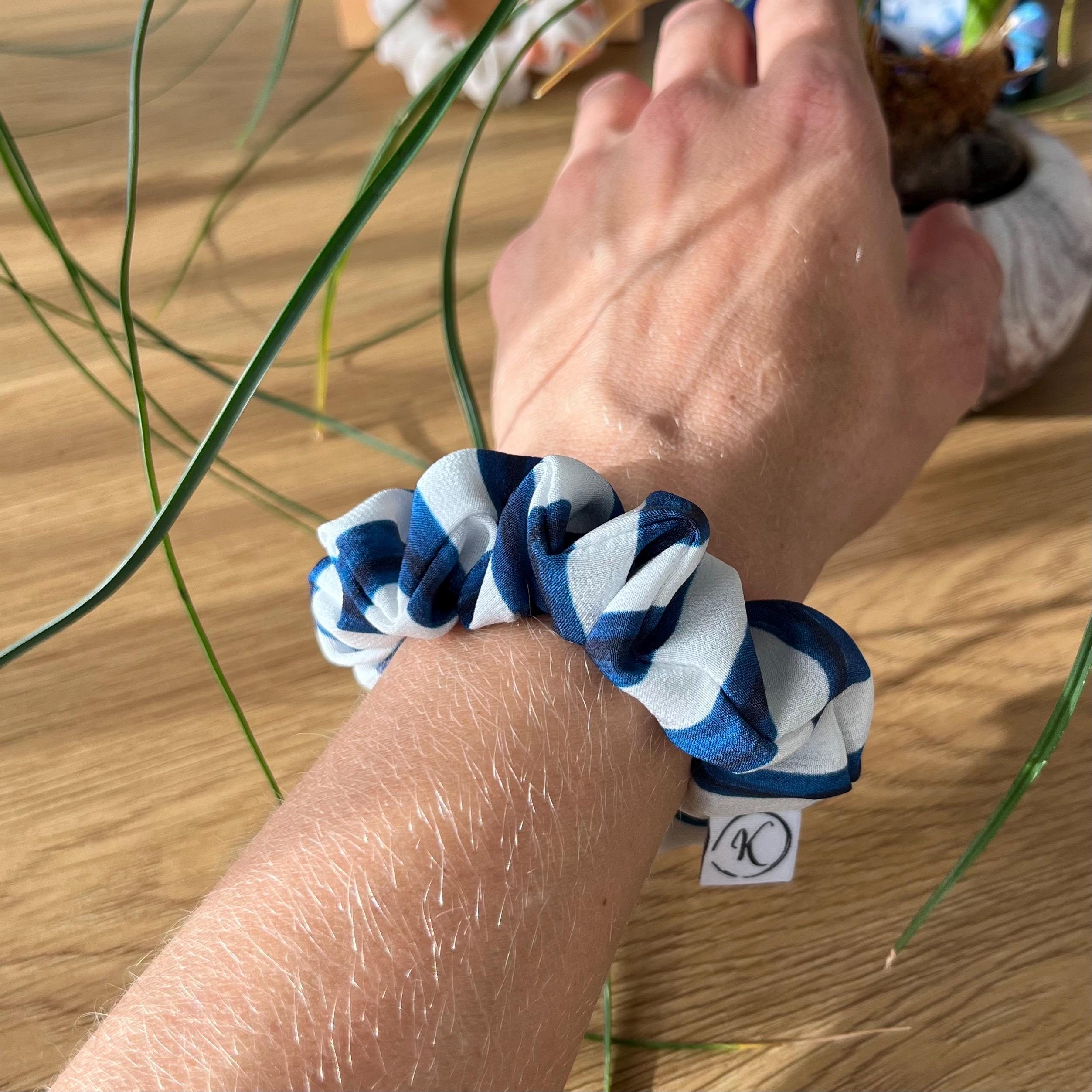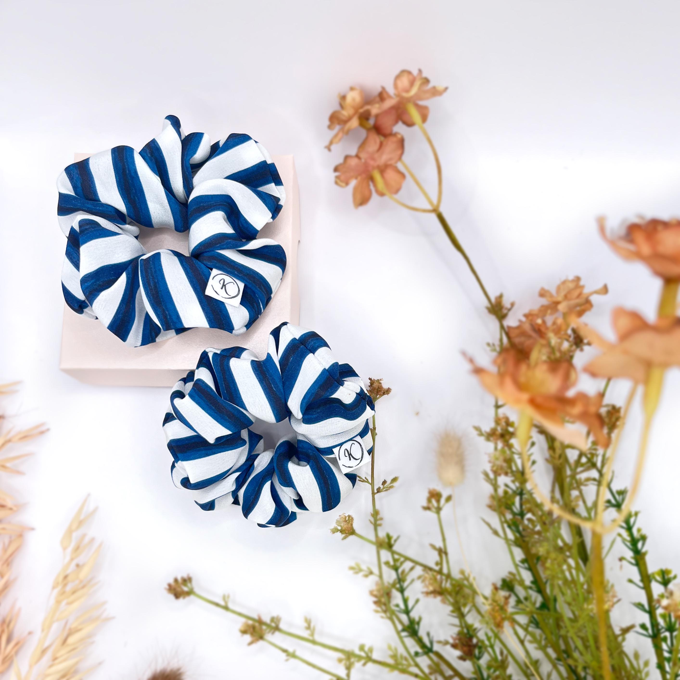 Add a touch of elegance to your hairstyle with this scrunchie, crafted from 100% silk crepe, a discontinued item from an Italian fashion house. Its black, white, and blue striped pattern creates a subtle balance between dynamism and sophistication.