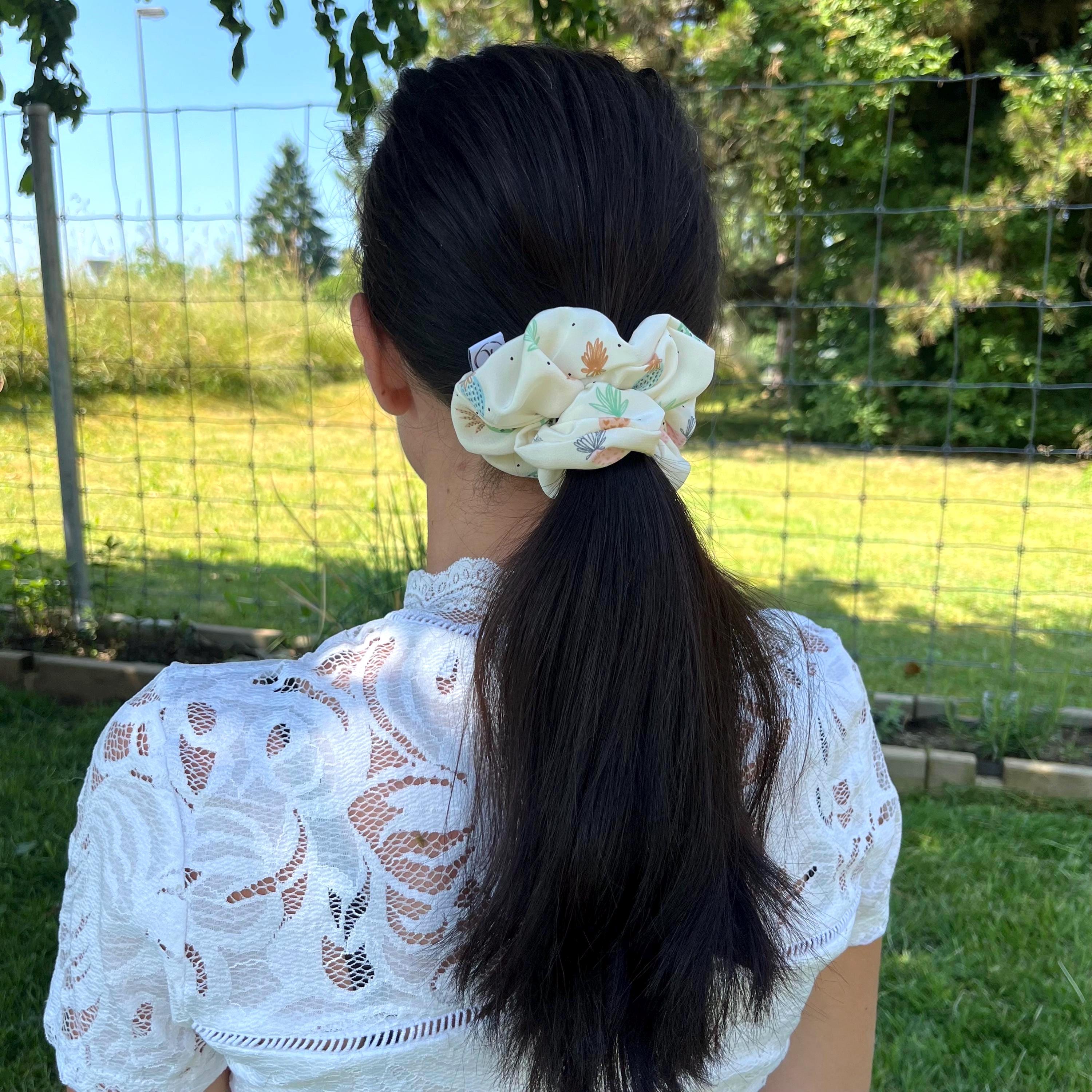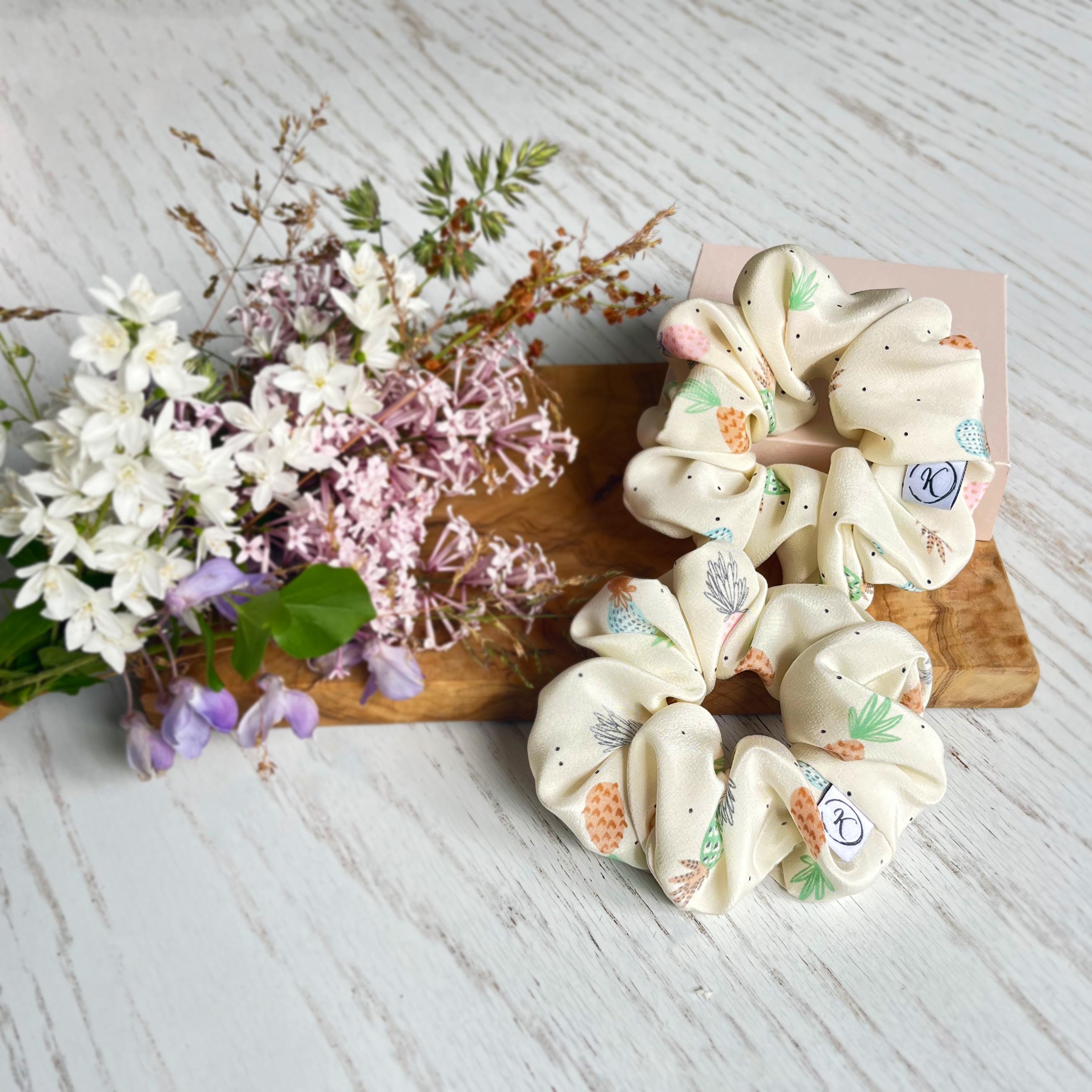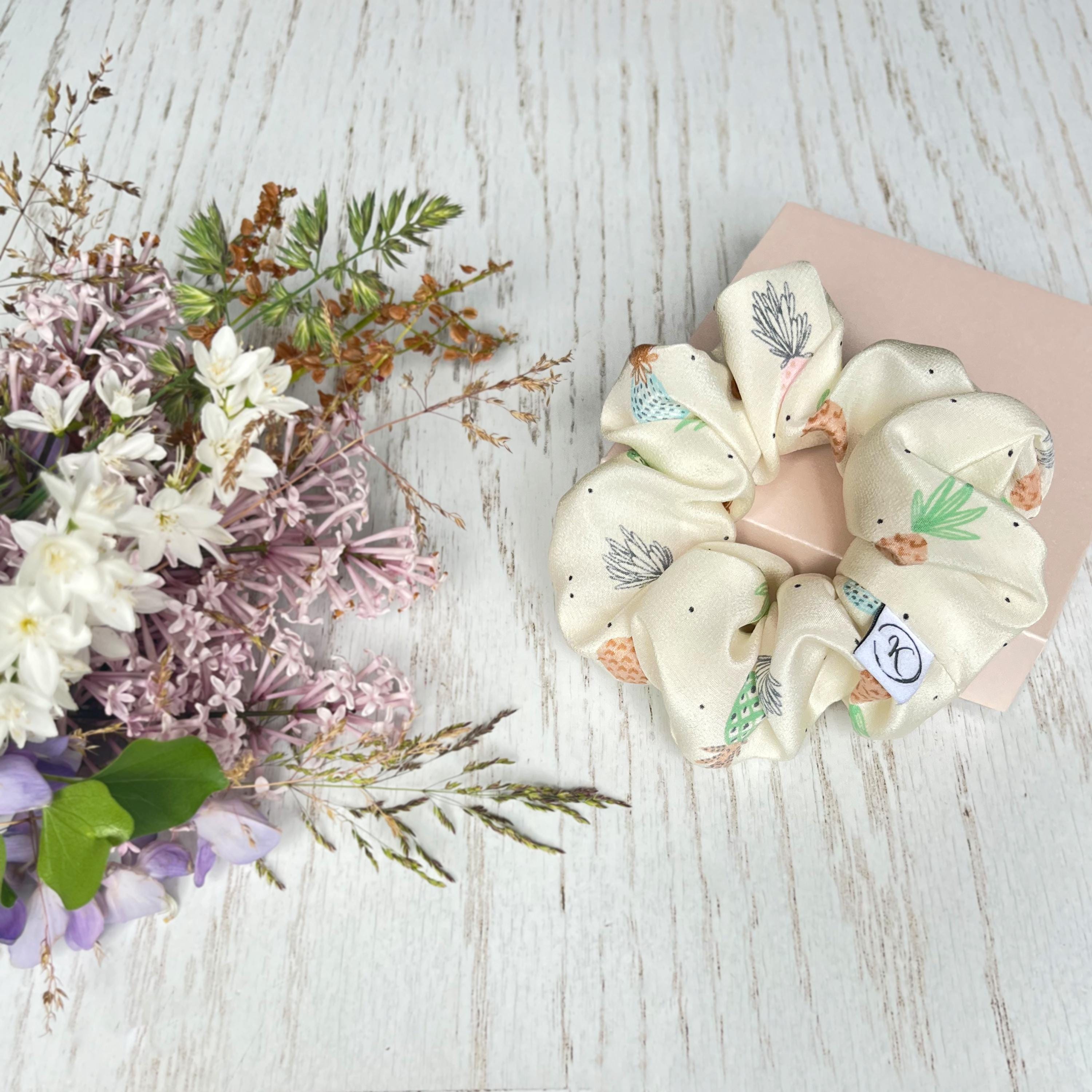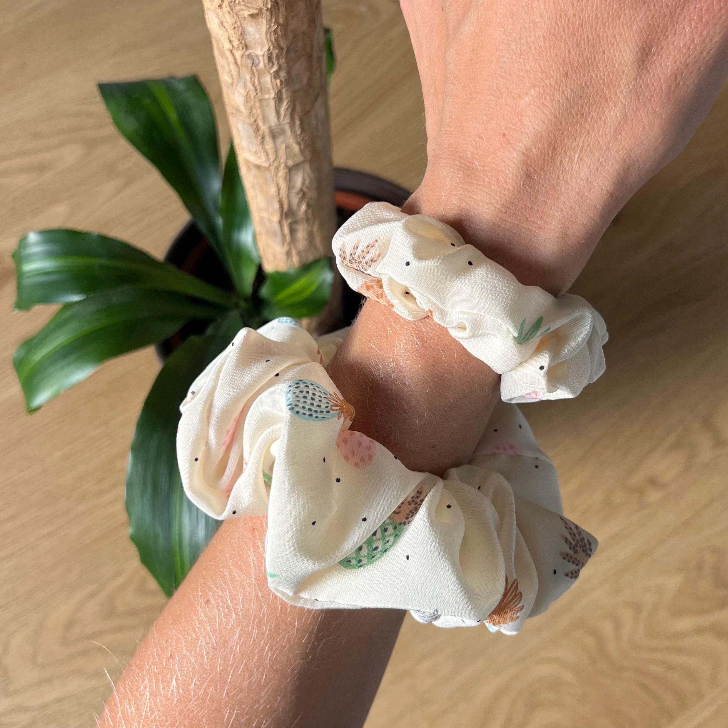 Natural silk scrunchie with pineapple pattern, Lightweight satin silk, Upcycled couture, Summer hair accessory, Handmade in Switzerland, Gift for girls