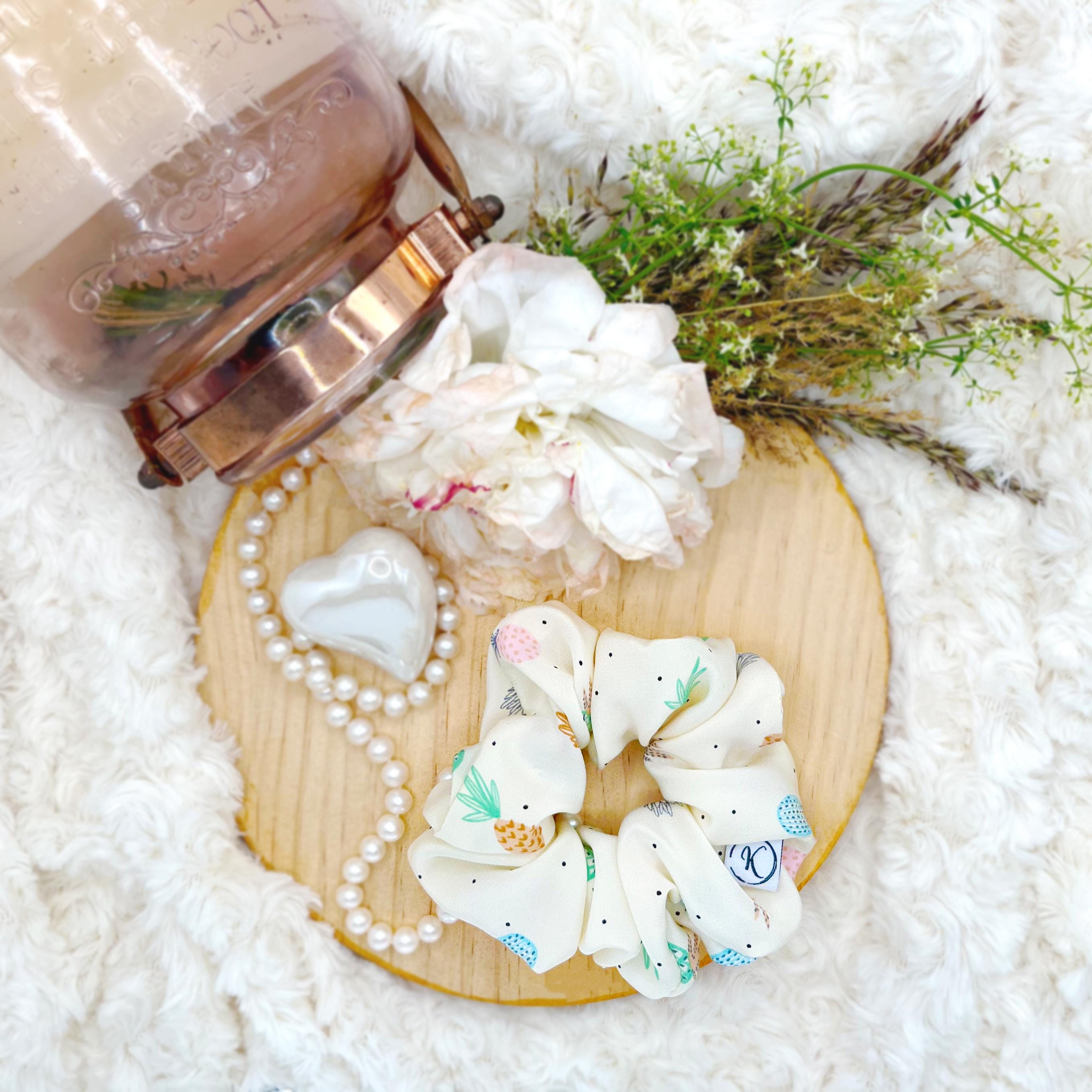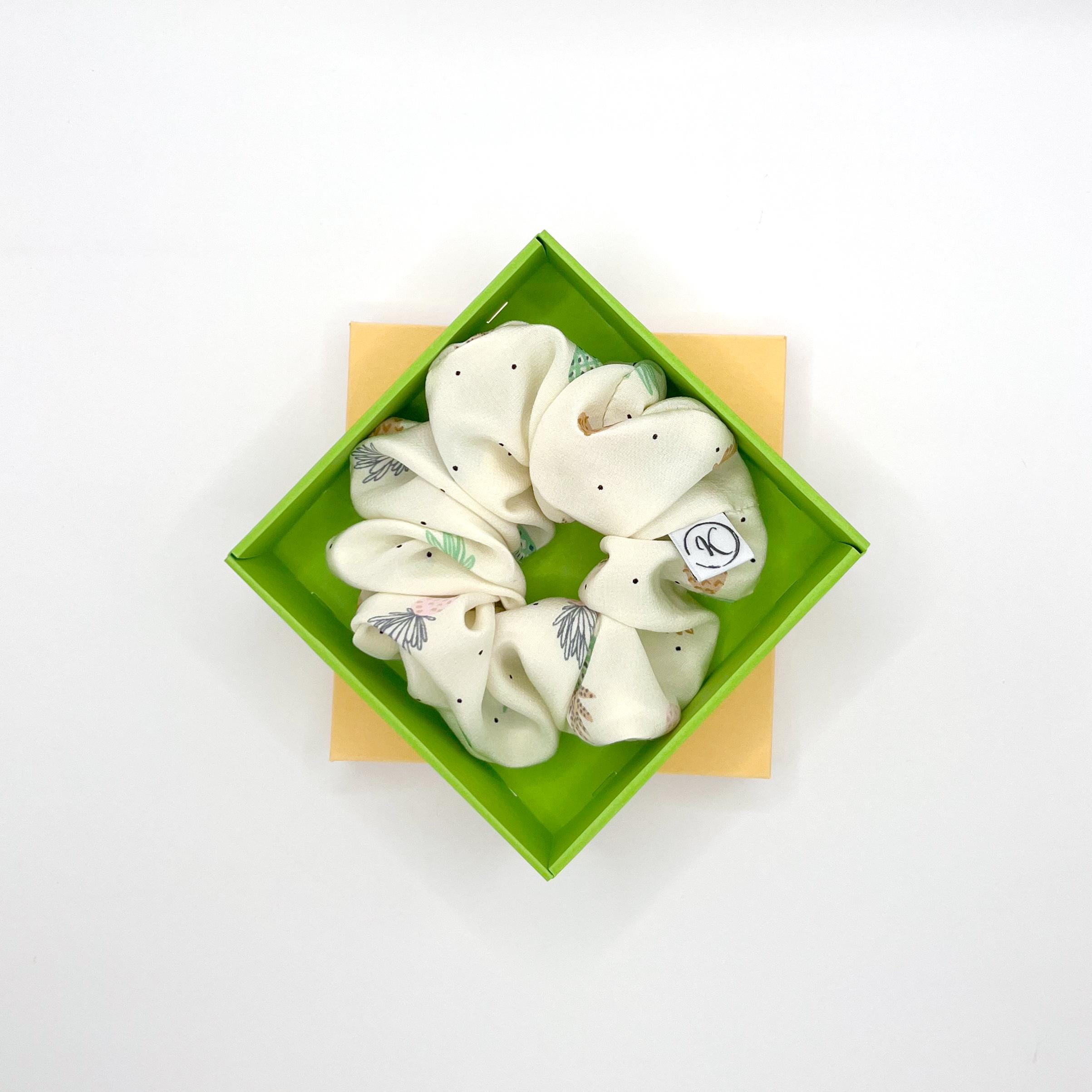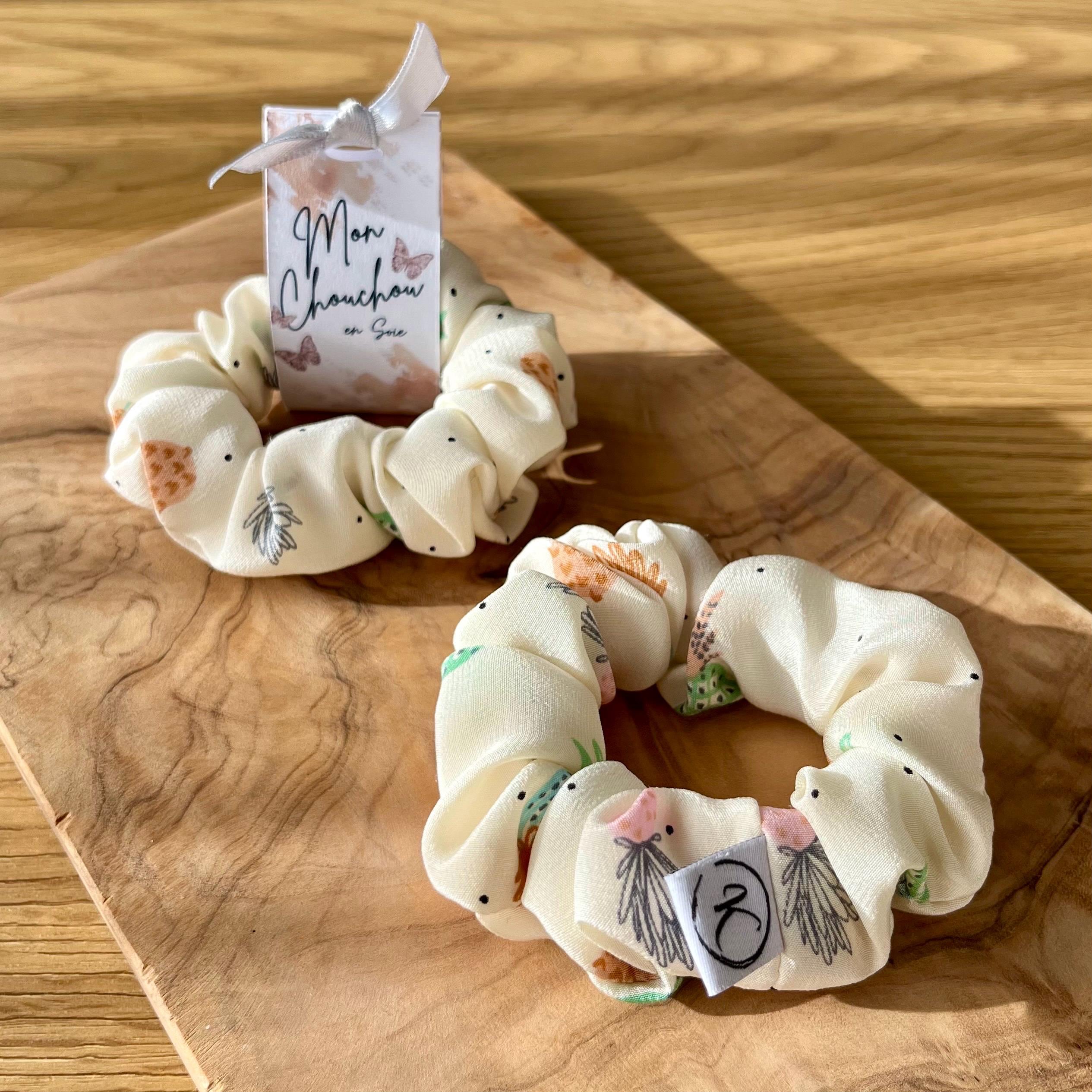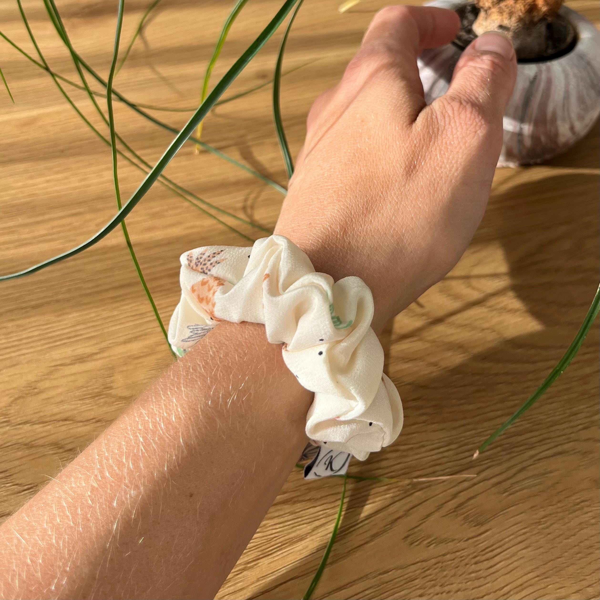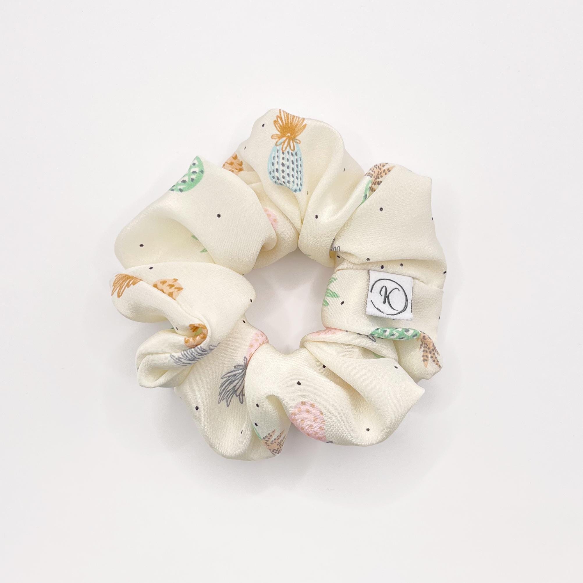Natural silk scrunchie with pineapple pattern, Lightweight satin silk, Upcycled couture, Summer hair accessory, Handmade in Switzerland, Gift for girls